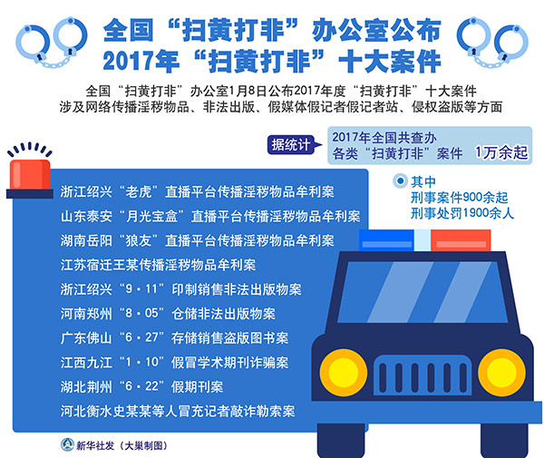 圖表:全國(guó)“掃黃打非”辦公室公布2017年“掃黃打非”十大案件 新華社發(fā) 大巢制圖