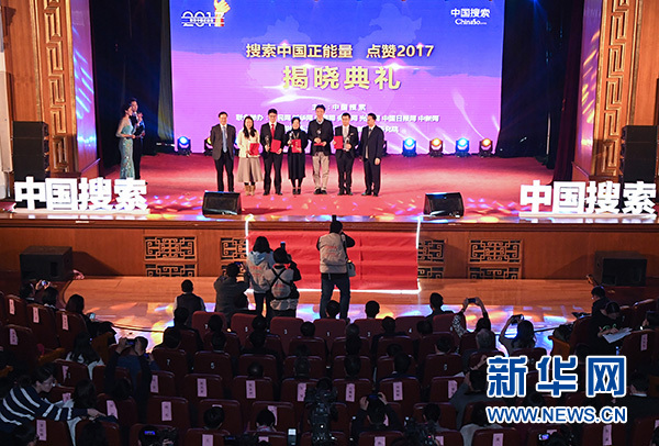 1月19日,“搜索中國正能量點贊2017”活動獲獎企業代表在頒獎典禮上領獎。當日,由中國搜索創意策劃,聯合多家中央重點新聞網站和北京大學新媒體研究院共同舉辦的“搜索中國正能量點贊2017”大型網絡宣傳活動揭曉典禮在北京舉行。此次活動歷時兩月,征集評選出“精彩中國、創新中國、美麗中國、公益中國、品牌中國”五大系列23個熱搜、點贊榜單。新華社記者 李賀 攝
