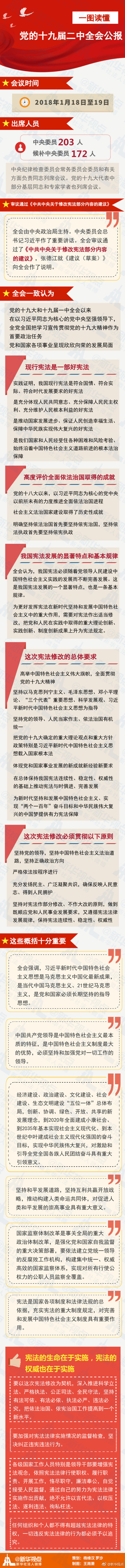新華網北京1月20日電 黨的十九屆二中全會公報新鮮出爐,公報有哪些重要內容?這次憲法修改的總體要求是什么?一圖讀懂!(據新華視點微博)