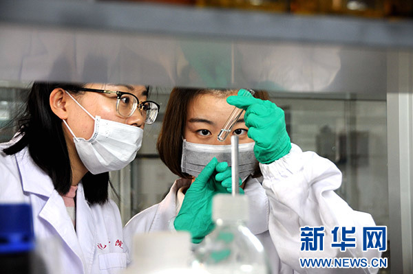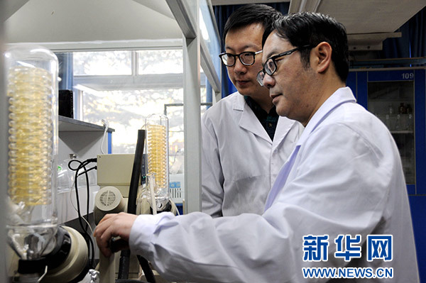 1月19日,蘭州交通大學天然藥物開發研究所教授沈彤(右)和他的學生一同進行生物農藥試驗。新華社發(王銘禹 攝)