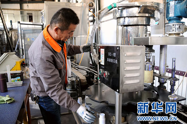 1月19日,在甘肅省植物源生物農藥工程技術研究中心生產車間,工人在生產生物農藥。新華社發(王銘禹 攝)