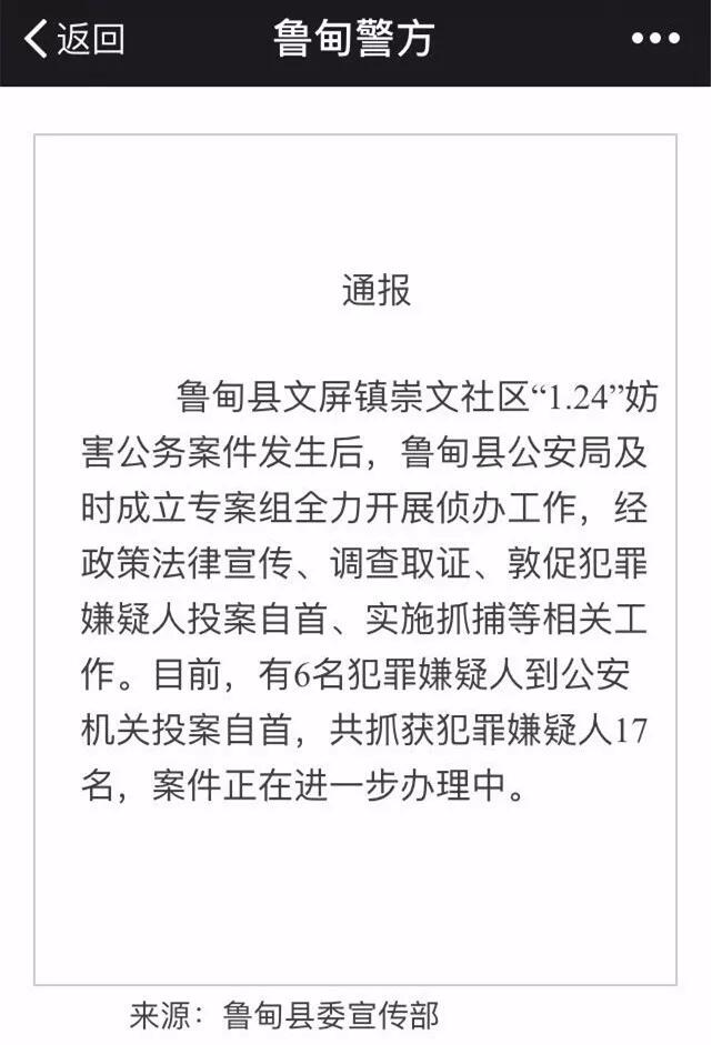 1月26日,云南昭通魯?shù)榭h委宣傳部就“不法者圍攻干警”一事通報稱,目前有6名犯罪嫌疑人已到公安機關(guān)投案自首,共抓獲犯罪嫌疑人17名,案件正在進一步辦理中。