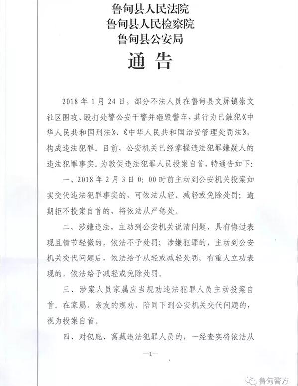 與此同時,魯?shù)榭h公安局、法院、檢察院聯(lián)合發(fā)出通告稱,部分不法人員在魯?shù)榭h文屏鎮(zhèn)崇文社區(qū)圍攻、毆打處警公安干警并砸毀警車,其行為已觸犯《中華人民共和國刑法》、《中華人民共和國治安管理處罰法》,構(gòu)成違法犯罪,公安機關(guān)已經(jīng)掌握違法犯罪嫌疑人的違法犯罪事實,限期在2月3日凌晨0點前主動到公安機關(guān)投案自首、交代違法犯罪事實,可依法從輕、減輕或免除處罰,逾期拒不投案自首的,將依法嚴懲。