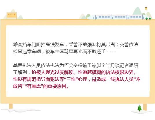 基層執(zhí)法人員依法執(zhí)法為何會變得縮手縮腳?半月談記者調(diào)研了解到,怕被人曝光過度解讀、怕逾越模糊的執(zhí)法權(quán)限邊界、怕沒有規(guī)范指導(dǎo)而犯法等“三怕”心理,是造成一線執(zhí)法人員“不敢管”“有顧慮”的重要原因。
