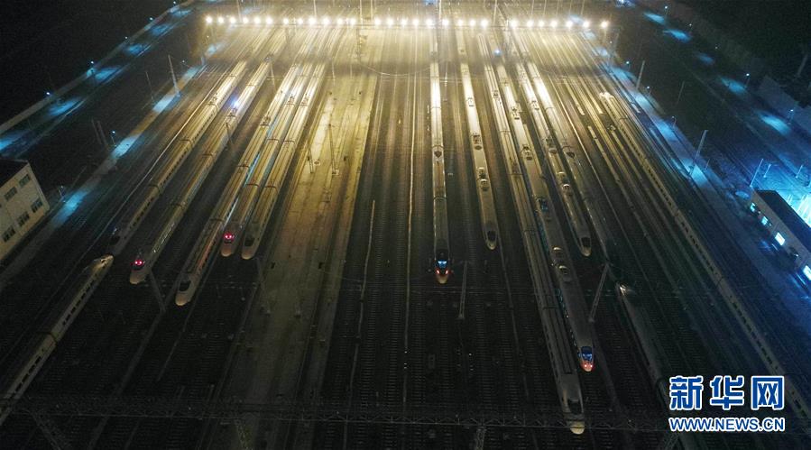 這是1月31日清晨在貴陽北動車運用所拍攝的動車組列車。春運即將開始,貴陽北動車運用所各個系統的工作人員對動車組列車進行全面細致的“體檢”,確保春運期間動車組列車安全運行。新華社發 吳吉斌 攝