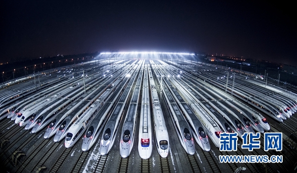 2018年2月1日凌晨,動(dòng)車組停靠在武漢動(dòng)車段的存車線上,準(zhǔn)備進(jìn)行檢修和保溫作業(yè)。新華社記者 肖藝九 攝