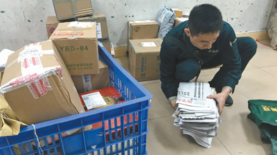 羅金城整理將投遞的報刊、包裹。