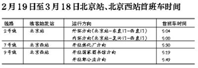 2號線、7號線、9號線2月19日至3月18日首班車時段加開;緩解北京站、北京西站返程客流壓力