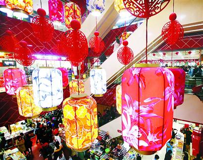南京路一商店內(nèi)彩燈高掛,市民喜氣洋洋置辦年貨,一派歡樂(lè)景象。記者 邵劍平 攝