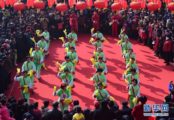 2月22日,在河北省滄州市新華區舉行的“民俗展演鬧新春”活動上,腰鼓愛好者在表演腰鼓。當日是正月初七,各地舉行豐富多彩的民俗文化展演活動,熱熱鬧鬧歡慶新春。 新華社發(傅新春 攝)