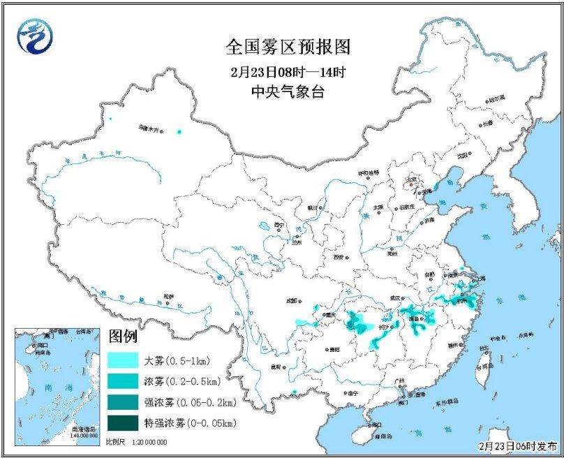 全國霧區(qū)預報圖(2月23日08時-14時)
