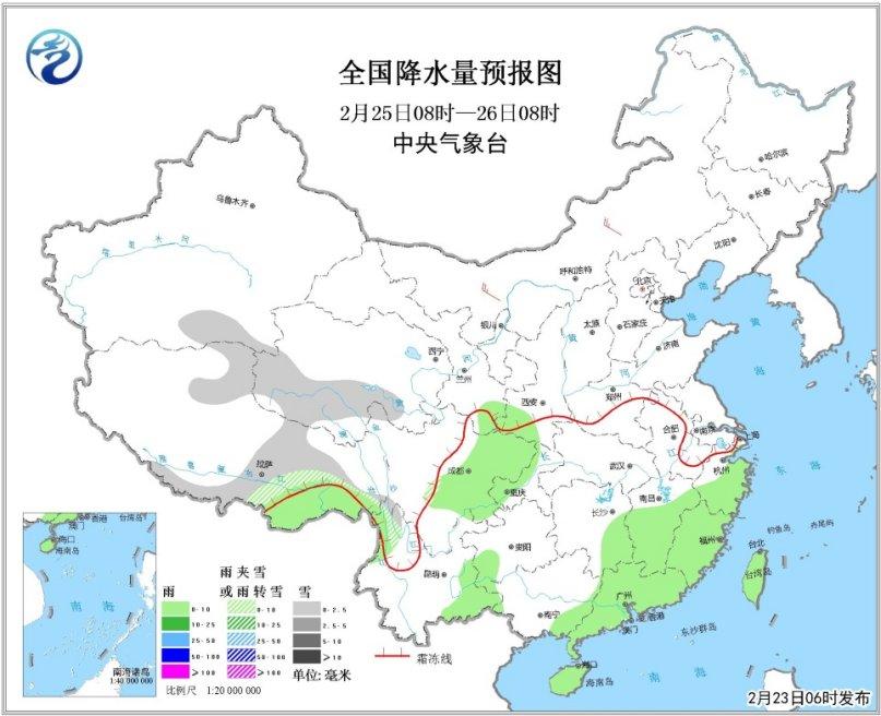 25日08時至26日08時,青藏高原中部和南部等地有小雪或雨夾雪;西北地區(qū)東南部、四川盆地、江南南部、華南中東部、云南西北部和東南部、海南島、臺灣等地有小雨。內蒙古中西部等地有4~5級風。