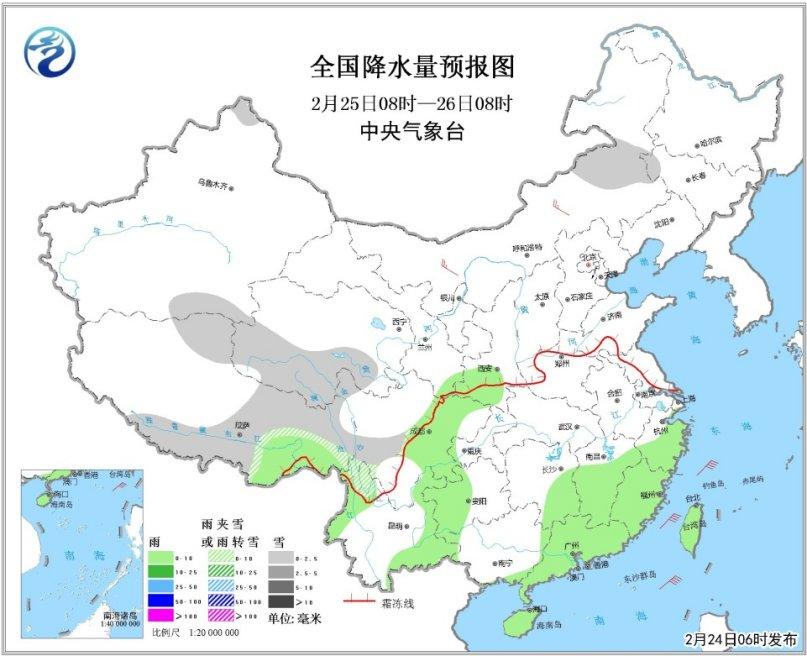 24至25日,西南地區(qū)東部、江漢、江淮、江南大部、華南等地有小到中雨。26日夜間起,南方地區(qū)將自西向東出現(xiàn)一次中到大雨過程。