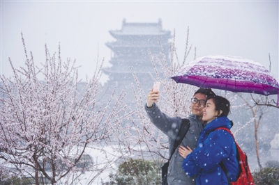 陰晴雨雪關系百姓生活,因此廣受關注。圖為日前山西省晉中市平遙縣迎來降雪天氣,游客在古城門外合影留念。梁生仁攝(新華社發)