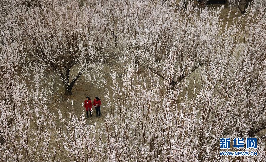 3月28日,游客在敦煌鳴沙山下的李廣杏園內賞花。近日,甘肅省敦煌市鳴沙山下8000多畝李廣杏花競相開放,吸引了眾多游客和市民踏青賞花。 新華社記者陳斌攝