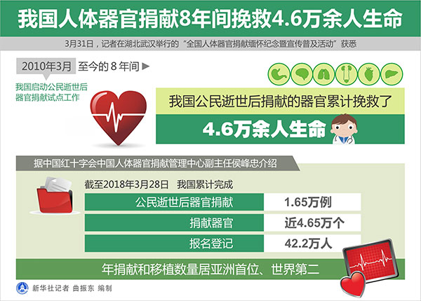新華社武漢4月1日電(記者馮國棟)記者31日在湖北武漢舉行的“全國人體器官捐獻(xiàn)緬懷紀(jì)念暨宣傳普及活動”獲悉,2010年3月我國啟動公民逝世后器官捐獻(xiàn)試點(diǎn)工作至今的8年間,我國公民逝世后捐獻(xiàn)的器官累計挽救了4.6萬余人生命。