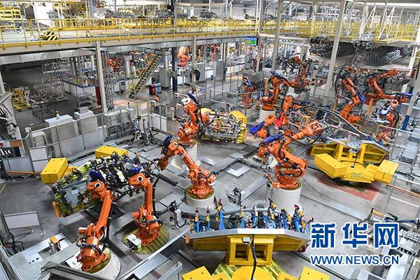 3月27日,焊接機器人在浙江臨海的吉利汽車生產車間工作。新華社記者 殷博古 攝