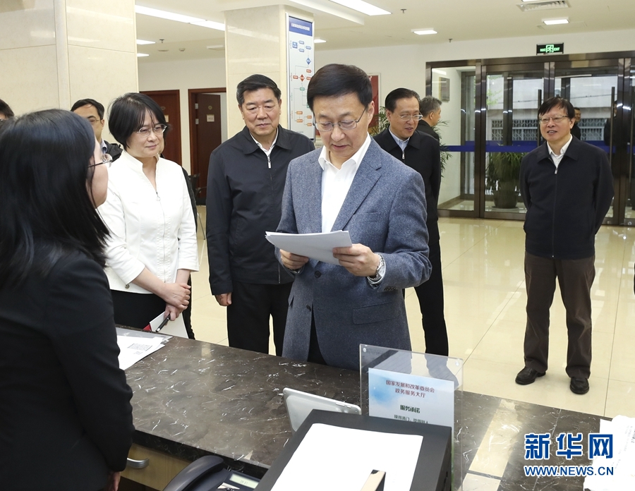 4月3日,中共中央政治局常委、國務院副總理韓正到國家發展改革委調研并主持召開座談會。這是韓正在國家發展改革委政務服務大廳考察。新華社記者 龐興雷 攝