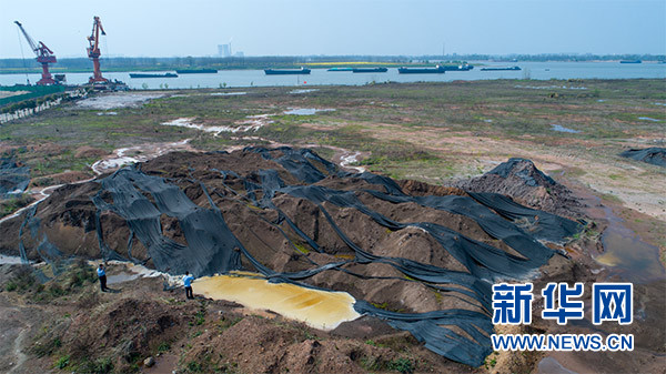 這是3月29日用無人機(jī)拍攝的安徽貴池前江工業(yè)園內(nèi)池州恒鑫材料科技有限公司廠區(qū)內(nèi)的長江堤岸旁傾倒的選礦尾渣。新華社記者 郭晨 攝