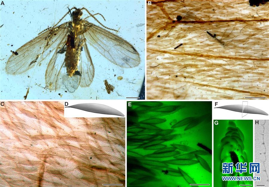 緬甸琥珀中飄翅目昆蟲及其鱗片結(jié)構(gòu)的圖片。新華社發(fā)(中國科學(xué)院南京地質(zhì)古生物研究所提供)