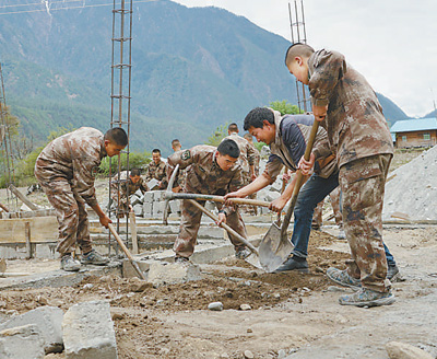 上察隅鎮松林村藏族同胞玖五家建房缺幫手,邊防官兵主動前往幫忙。 記者 鄧建勝攝