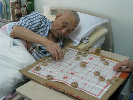 德勝社區衛生服務中心臨終關懷科一位正在下象棋的老爺爺。該科室護士長劉曉惠說,這位老爺爺唯一的愛好就是下象棋,“要是下跳棋我們還能陪一陪,象棋都不會”。于是,醫院便找了一位會下棋的護工陪這位老爺爺下象棋。圖片中下象棋用的硬紙板也是護士們幫忙做的。德勝社區衛生服務中心臨終關懷科供圖