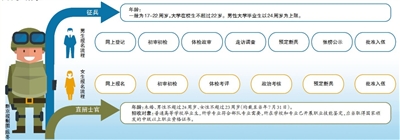 男青年應征需經過網上登記、初審初檢、體檢政審、走訪調查、預定新兵、張榜公示、批準入伍7個環節。