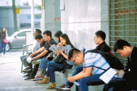 4月21日,在四川省公招公務員考點外,應考者正在抓緊時間復習備考。