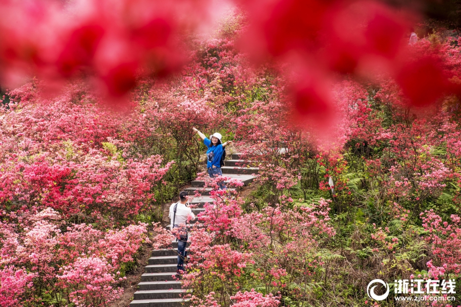4月21日,全國森林旅游示范縣、浙中杜鵑谷——磐安縣盤峰鄉高姥山核心區塊的2000多畝各色杜鵑競相爭艷,滿山遍野杜鵑姿態萬千,花團錦簇,身臨其中,宛如置身仙境。(浙江在線拍友 陳溢之 攝)