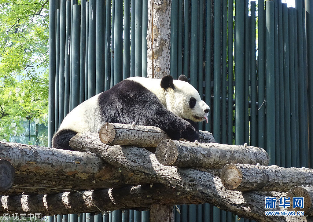 5月2日,在動物園內(nèi),熊貓曬著太陽,時不時伸個懶腰,翻個身,笨拙的動作盡顯萌態(tài)。(圖片來源:視覺中國)