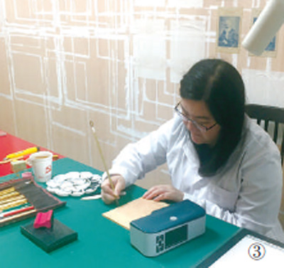 無影燈下,大大小小的毛筆、毛刷整齊排列,調(diào)色盤中墨色深淺不一,一臺小型分色測試儀隨時“待命”;桌上有根據(jù)文物原件打印出來的精細(xì)放大圖像和色彩分析數(shù)據(jù);右手邊是帶有通風(fēng)裝置的操作臺;房間盡頭處有帶過濾架的水槽,專供清洗印染后的紙張……