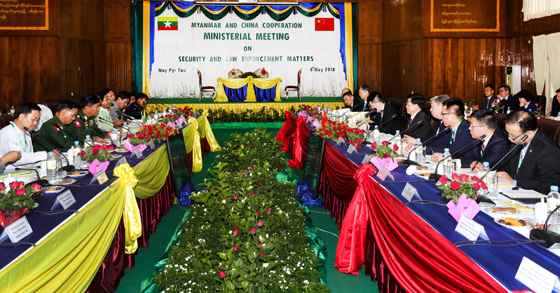 中國駐緬甸大使洪亮、公安部副部長李偉,緬甸內政部副部長昂梭、內政部常務秘書丁敏、警察總監昂溫烏等參加會談。(圖:滿博)