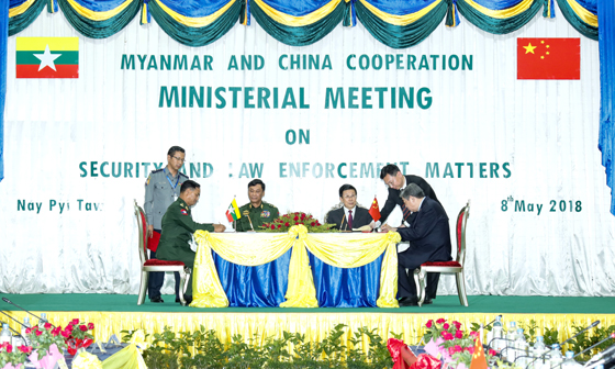 5月8日,國務委員、公安部部長趙克志在內比都與緬甸內政部部長覺瑞舉行會談。圖為會談后,雙方簽署有關合作文件。