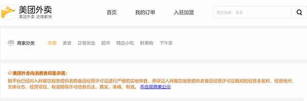 從哪里看違規(guī)餐飲店鋪公示情況?首先,打開三個外賣平臺的網(wǎng)頁版并登陸,選擇“北京地區(qū)”后,可以看到網(wǎng)頁最上端明顯位置發(fā)布了這樣的承諾:“我平臺已經(jīng)對入網(wǎng)餐飲服務(wù)提供者的食品經(jīng)營許可證進(jìn)行嚴(yán)格的實地審查,并保證入網(wǎng)餐飲服務(wù)提供者食品經(jīng)營許可證載明的經(jīng)營者名稱、經(jīng)營場所、主體業(yè)態(tài)、經(jīng)營項目、有效期等許可信息合法、真實、準(zhǔn)確、有效。”