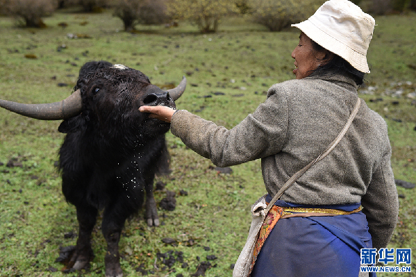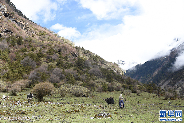 卓嘎在山上喂牛(5月9日攝)。新華網記者 馬藝萌 攝