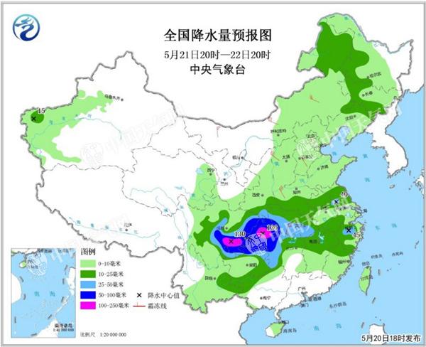 預計21日08時至22日08時,四川盆地大部、重慶大部、貴州北部、陜西南部、河南南部、湖北西部和東南部等地的部分地區有大到暴雨,其中,四川盆地東部、重慶西部的局地有大暴雨(100~140毫米);上述部分地區伴有雷電、短時強降水(30~50毫米,局地70毫米以上)、雷暴大風等強對流天氣。