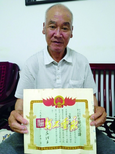 董存金手捧哥哥董存瑞烈士“光榮犧牲,永垂不朽”的紀念證