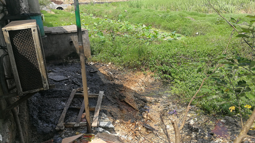 一家縣城周邊的農莊,餐廚污水、廢棄物長時間排放到一個小水塘,堆滿了黑色或黃色的濕乎乎、粘稠狀污物,旁邊緊鄰著稻田和一條灌溉水渠。記者 白田田 攝
