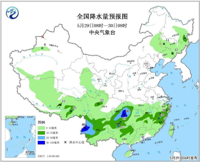 5月29日08時至30日08時,西藏、西南地區大部、江南、華南大部、黑龍江東部、吉林、遼寧中北部、內蒙古東部等地有小到中雨,其中,云南西部、貴州中東部、重慶東南部、湖南西部等地的部分地區有大雨或暴雨(50~90毫米)。上述部分地區有短時強降水、雷暴大風等強對流天氣。新疆中北部、內蒙古東部、東北地區西部等地的部分地區有4~6級風,北疆山口地區風力可達8~9級。黃海東北部海域、黃海西南部和東南部的部分海域將有大霧,能見度不足1公里。