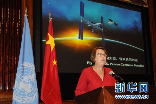 5月28日,在奧地利首都維也納,聯合國外層空間事務辦公室主任西莫內塔·迪皮波在公告發布儀式上講話。新華社記者劉向攝