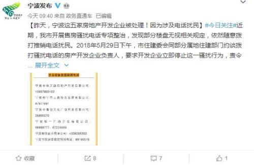 2018年5月29日下午,寧波市住建委會同部分屬地住建部門約談撥打騷擾電話的房產開發企業負責人,要求開發企業立即停止這一騷擾行為,責令其限期整改,并處以暫停網簽、延緩發放預售許可證等相關處罰措施。