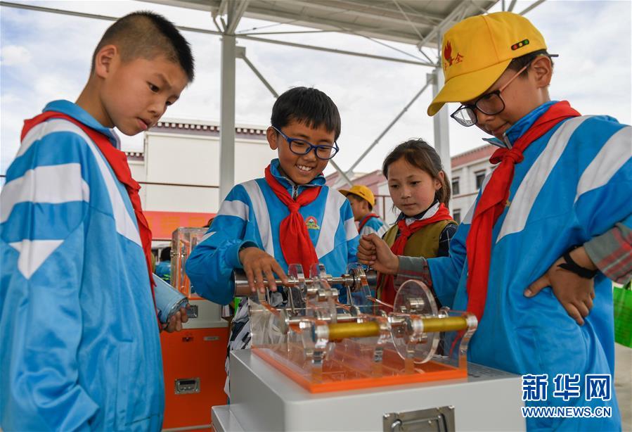 幾名學(xué)生在拉薩市流動(dòng)科技館巡展活動(dòng)現(xiàn)場(chǎng)體驗(yàn)科學(xué)小實(shí)驗(yàn)(5月24日攝)。 新華社記者 劉東君 攝