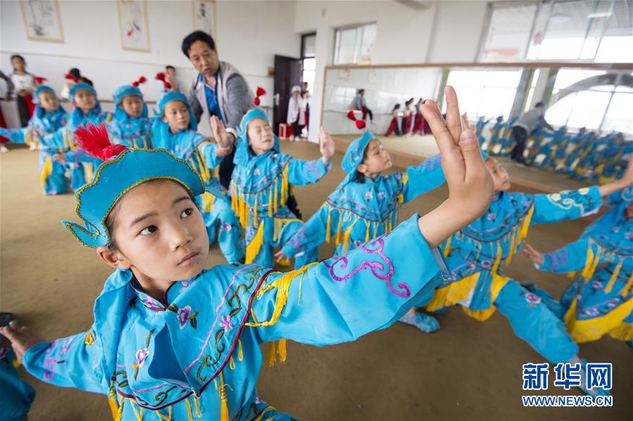 江蘇省南通市海安縣西場(chǎng)小學(xué)學(xué)生在練習(xí)京劇(5月26日攝)。新華社發(fā)(徐勁柏 攝)