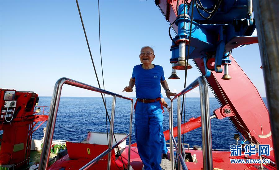 2018年5月13日,汪品先院士從“深海勇士”號(hào)載人艙走向母船。新華社記者 張建松 攝