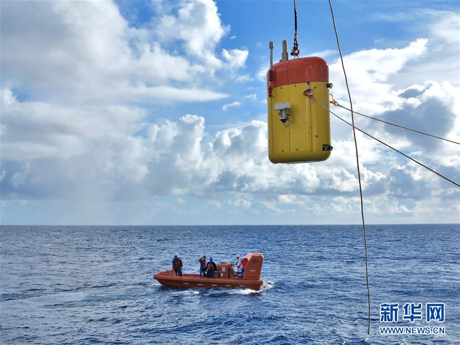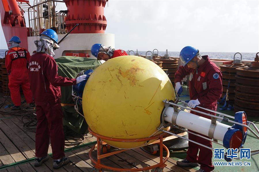 科考隊員在安裝潛標的主浮球(2017年12月4日攝)。新華社發