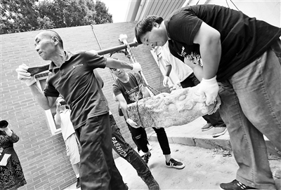 在昨天的文物搬運現場,兩位工人挑擔子,兩位工人用手托住龍頭兩邊,四人費了好大勁才將螭頭搬到車上,開啟“回家”之路。待螭頭到達圓明園后,將有專家對它們進行全身“體檢”,制定修復方案。“這些螭頭有一些小裂縫,如果不好好保護,時間久了容易出問題。”圓明園文物考古科科長陳輝說。(記者 李夢婷)