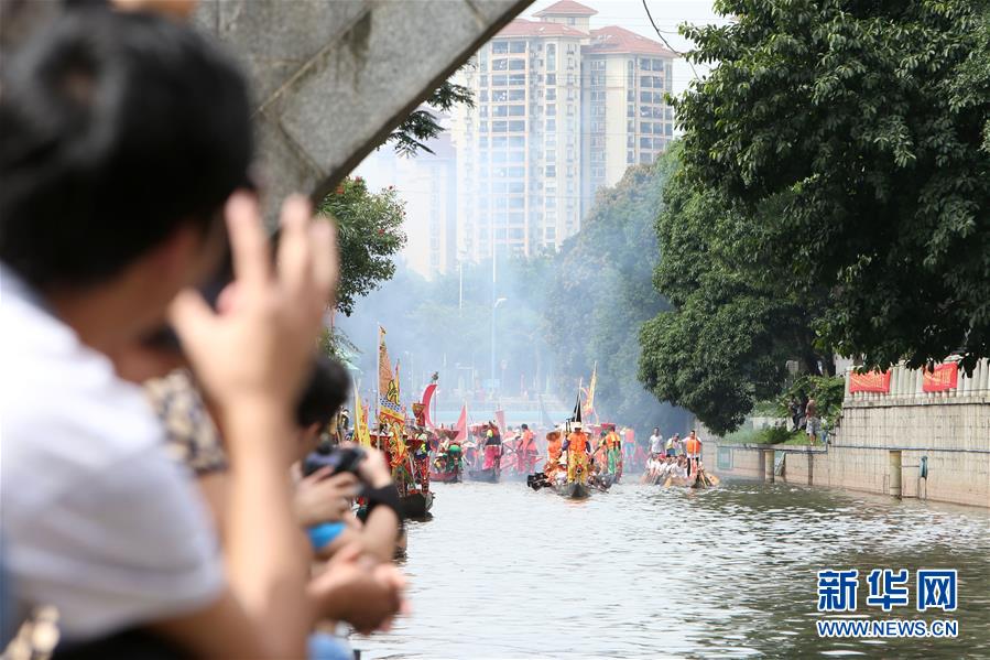 6月14日,觀眾在廣州市天河區一處河道旁等待龍舟通過。當日,廣州市天河區舉行一場熱鬧歡快的龍舟活動,來自多個村莊“走親戚”的龍舟隊參加。按廣州的傳統習俗,每年農歷五月初一至初五,各村的龍舟隊要到周圍村落“走親戚”。走親戚的龍舟隊到來時,受訪村子要準備好龍舟飯招待來客?;顒赢斕欤Q炮敲鑼,一派喜慶氣氛。新華社記者 張加揚 攝