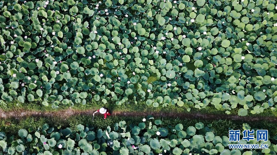 6月14日,游客在銅陵市西湖村荷花園內賞荷(無人機拍攝)。隨著氣溫升高,安徽省銅陵市西聯鎮西湖村荷花園內的300多畝荷花絢麗綻放,吸引游客前來賞荷。 新華社記者 張端 攝