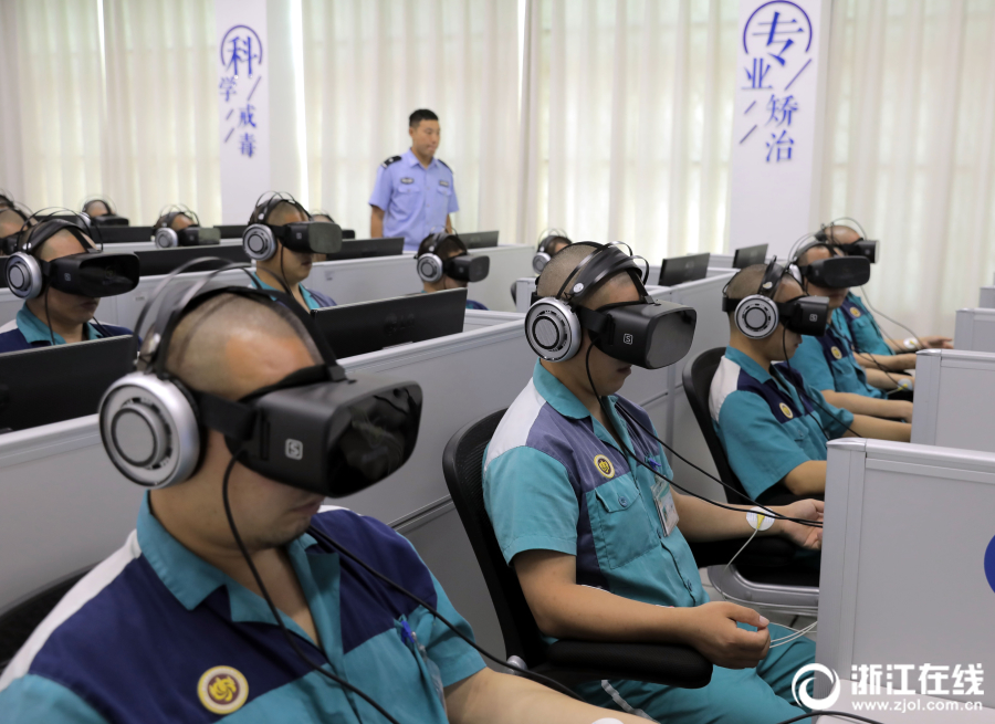 6月26日,浙江拱宸強制隔離戒毒所內,戒毒人員通過腦電技術和VR技術輔助戒毒。這些黑科技可以讓戒毒人員身臨其境地體會到吸毒的危害,從心理上減弱對毒品的依賴。(浙江在線記者 錢璐斌 徐文迪 攝)
