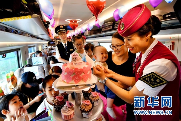 6月26日,在北京南至上海虹橋的G1次“復(fù)興號(hào)”列車上,乘務(wù)員與旅客一起切蛋糕慶祝。當(dāng)日,由北京南至上海虹橋的G1次“復(fù)興號(hào)”列車上舉行“復(fù)興號(hào)”運(yùn)營(yíng)一周年慶祝活動(dòng)。“復(fù)興號(hào)”是由中國鐵路總公司牽頭組織研制、具有完全自主知識(shí)產(chǎn)權(quán)、達(dá)到世界先進(jìn)水平的中國標(biāo)準(zhǔn)動(dòng)車組,自2017年6月26日投入運(yùn)營(yíng)以來,以其良好的乘車體驗(yàn)廣受旅客歡迎。新華社發(fā)(楊寶森 攝)